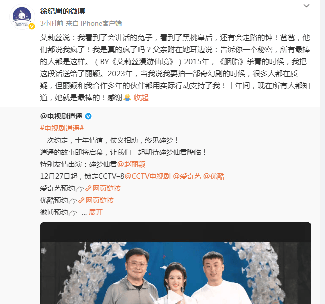 导演徐纪周同步发文,透露2015年合作《胭脂》杀青时曾将《爱丽丝漫游仙境》台词“所有最棒的人都是这样”赠予赵丽颖,并约定再合作。