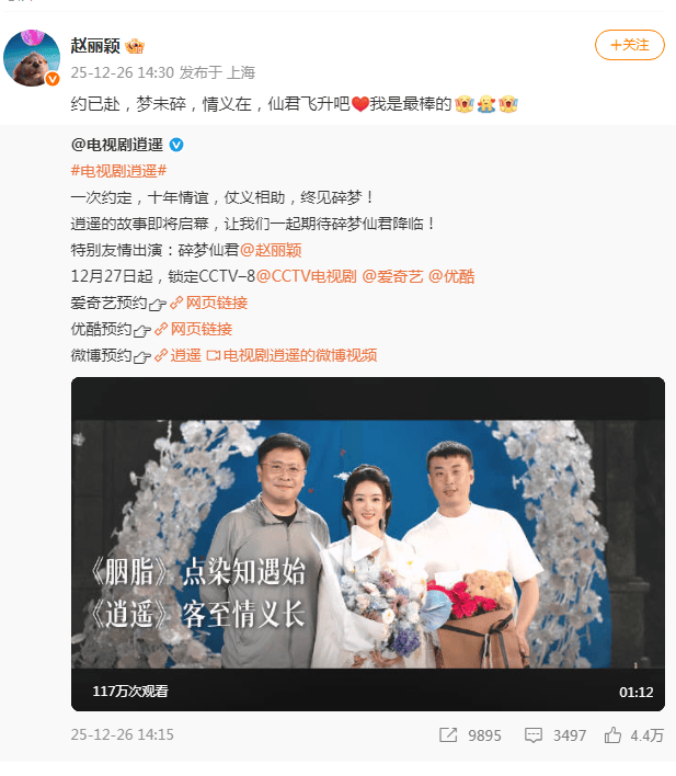 赵丽颖12月26日通过微博发布角色海报,配文“约已赴,梦未碎,情义在,仙君飞升吧我是最棒的”,并@剧方账号,单日话题阅读量破亿。