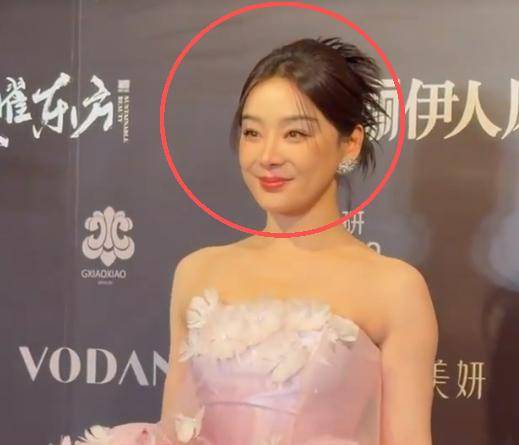 粉色礼服腰间的装饰,完全就是多余,不如直接去掉,还能更好的展现袁姗姗的腰臀比。