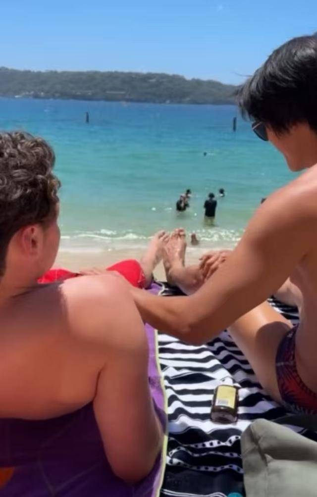 在阳光与沙滩的美景下,马在骧与对方并排躺在沙滩垫上,一起享受着这温暖的阳光,在此期间马在骧还更是深情地望着对方,更伸出手不断拍打和抚摸对方结实的胸肌。