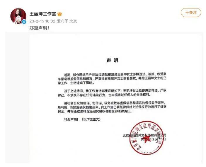2023年2月,王丽坤工作室声明其“遵纪守法,未涉案”,否认收受赃款。