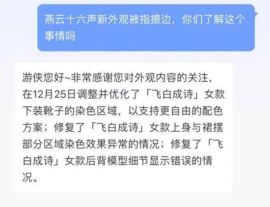 官方于12月25日回应称已优化女款下装靴子染色区域,修复上身与裙摆染色异常,并修正后背模型显示错误。同时宣布后续将为男女款时装各增加2套“裁造方案”,提供更多搭配选择。