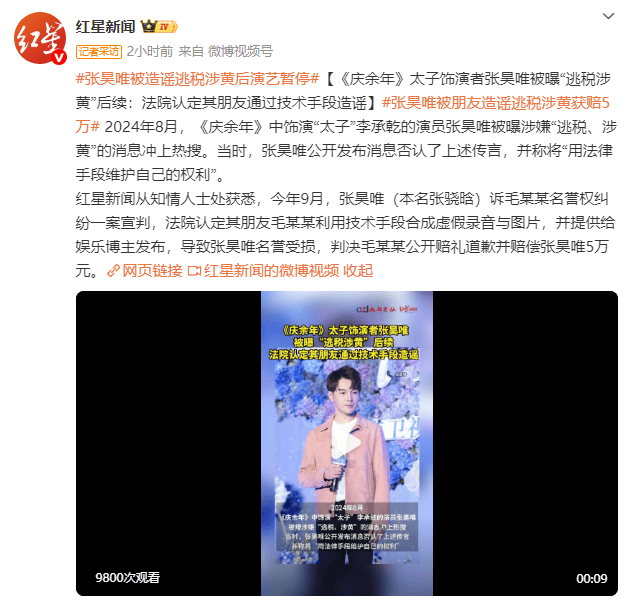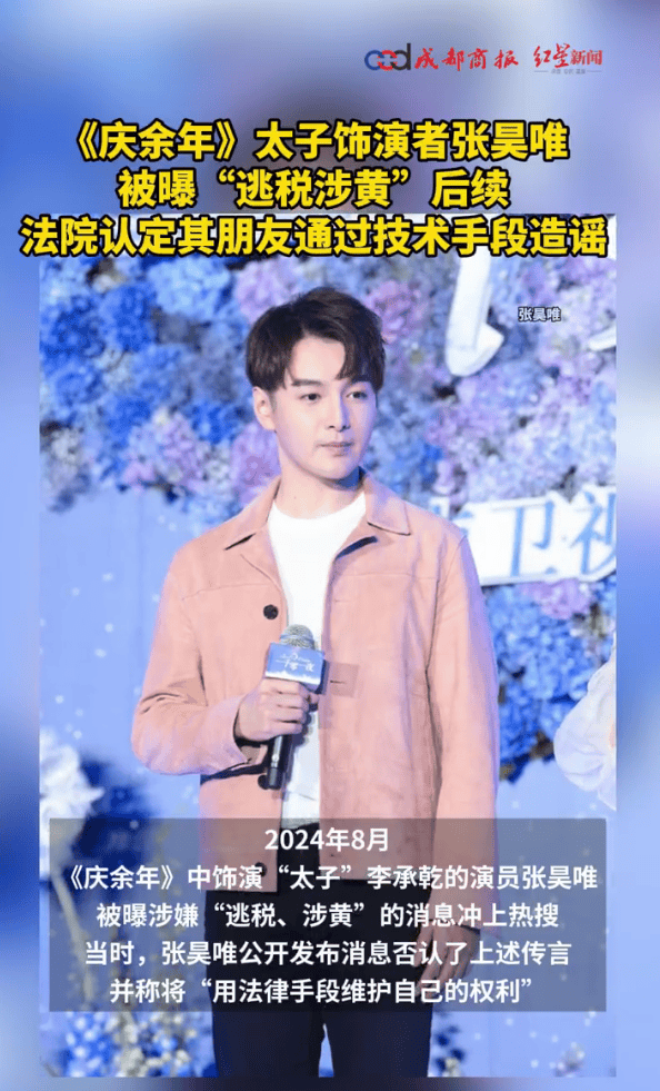 2024年8月,《庆余年》中饰演“太子”李承乾的演员张昊唯被曝涉嫌“逃税、涉黄”的消息冲上热搜。当时,张昊唯公开发布消息否认了上述传言,并称将“用法律手段维护自己的权利”。