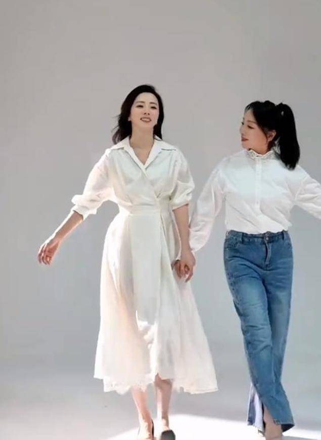 两人还穿了第二套,李思思穿的是白色连衣裙,偏现代风一些,而李妈妈穿着白色雪纺上衣搭配牛仔裤,倒是看起来比女儿还显年轻,扎上高马尾哪里看得出来年龄差来,怪不得李思思可以长得这么好看,完美的遗传了妈妈的美貌基因啊!