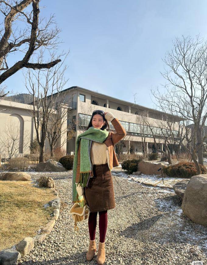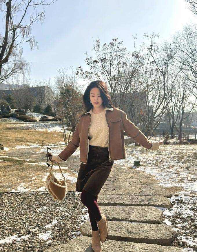 她身穿一件焦糖色的麂皮短外套,并搭配了米白色的绞花毛衣。下身则是一条棕色的灯芯绒半裙。酒红色的打底袜增添了几分复古的韵味,而她脚上的驼色短靴与毛绒包包则是同色系,整体搭配感觉非常舒适。