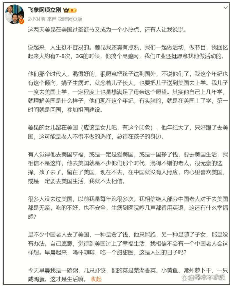 后来,一位了解情况的朋友(飞象网的项立刚)出面解释了情况。他说,网上流传的那个视频,其实是在中秋节拍的,并不是圣诞节。之所以被拿出来说是圣诞节,很可能是有人故意为之。至于为什么在中秋节会出现在美国,项立刚解释说,这是因为姜昆的女儿就在美国,作为父亲,尤其是年纪大了,去看望一下女儿、陪陪家人,也是很自然的事情。项立刚还提到,那个年代,有些条件比较好的家庭,确实会选择把孩子送到国外读书,他自己的儿子也去了美国。但他强调,很多有志向的孩子,在国外学成之后都会选择回国发展。所以,偶尔去美国探望女儿,在他看来是可以理解的。至于姜昆关闭评论区,项立刚也觉得,也许是为了避免不必要的麻烦和误解。