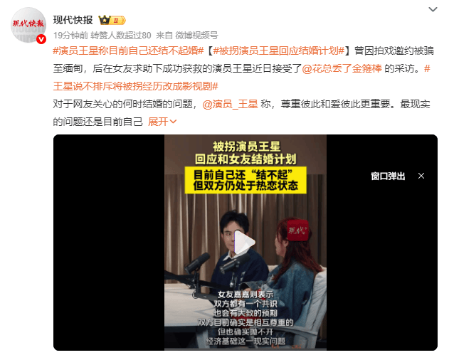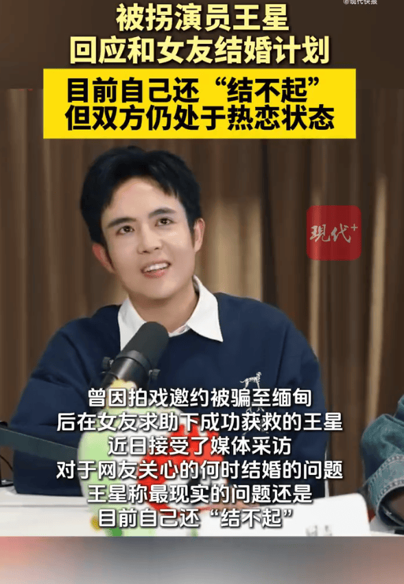 (来源:现代快报)曾因拍戏邀约被骗至缅甸,后在女友求助下成功获救的演员王星近日接受了“花总丢了金箍棒”的采访。对于网友关心的何时结婚的问题,王星称,尊重彼此和爱