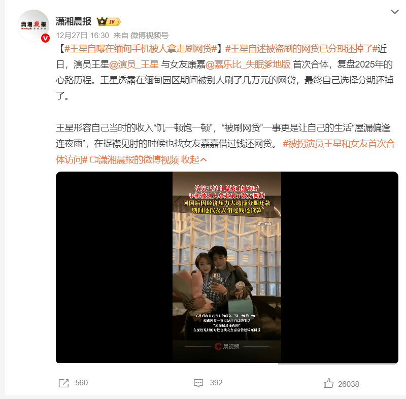 近日,演员王星与女友康嘉首次合体,复盘2025年的心路历程。王星透露在缅甸园区期间被别人刷了几万元的网贷,最终自己选择分期还掉了。