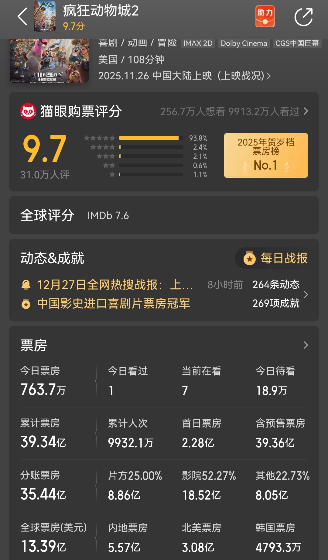 在全球市场,《疯狂动物城2》的累计票房超过了13亿美元,猫眼专业版的最终统计是13.39亿美元,是2025年好莱坞最卖座的电影。其中,北美票房约3亿美元,包括中国在内的海外票房已超10亿美元。