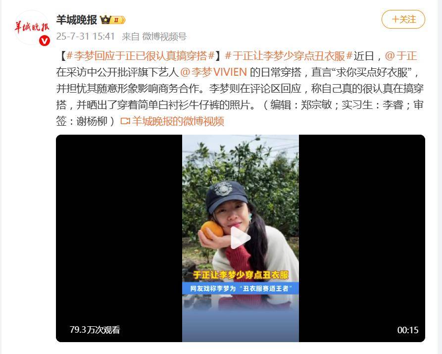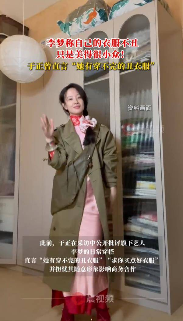 事件的导火索早在今年7月就已埋下。制片人于正多次在公开场合“恨铁不成钢”地批评旗下艺人李梦的日常穿搭,直言不讳地指出她有“穿不完的丑衣服”。从荧光绿长袖搭配堆堆裤,到碎花七分裤等造型,都被他视作可能影响商务合作的“灾难现场”,甚至隔空喊话:“求你买点好衣服。”在于正看来,艺人的形象管理直接关系到市场价值和商业机会,小众出格等同于风险。