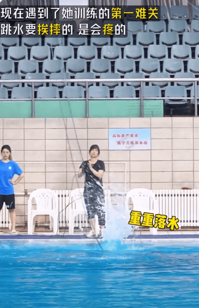 在何姿分享的小盒子最新训练画面中,吊着威亚练习动作的小盒子,每次重重落水的她要么摔到脸,要么摔到头。