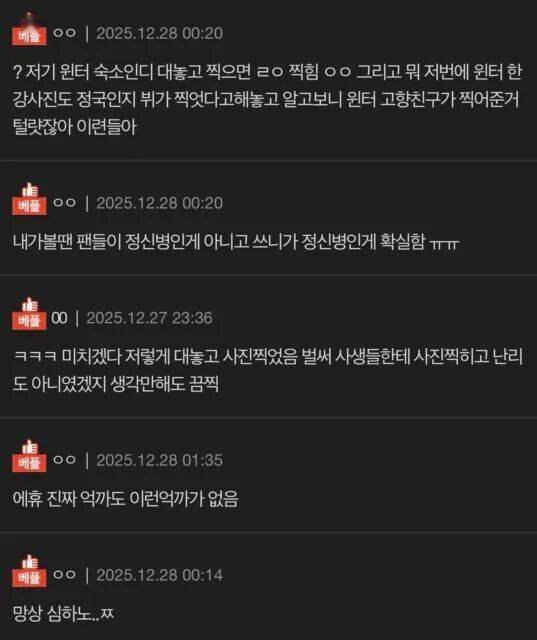 照片发布后,韩国网络社区Pann上迅速出现一篇热门帖子,发帖人言之凿凿地声称:“光看Winter的Instagram,明显就像是柾国拍的照片。”该帖进一步分析道,照片风格亲密,且“她居然在这种时候上传这种‘女友风’照片,还挺让人佩服的”,言语间暗示Winter在恋爱传闻背景下仍“大胆”分享此类内容,似乎侧面印证了猜测。