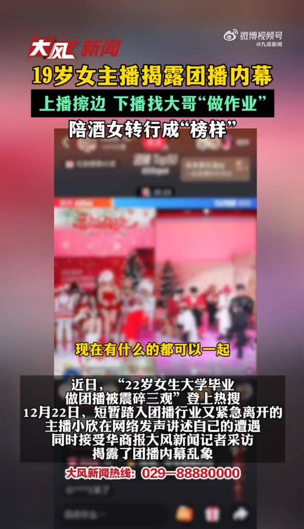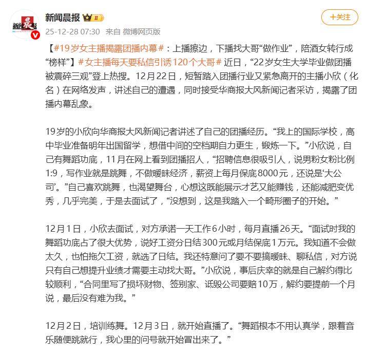 据12月28日报道,近日,一则“22岁女生大学毕业做团播被震碎三观”的热搜,撕开了直播行业光鲜表皮下的暗疮。12月22日,亲身趟过这滩“浑水”的19岁上海女孩小欣(化名)站出来发声,用自己短暂的从业经历,揭开了所谓“团播”背后,一套系统性的情感剥削与职场霸凌黑幕。
