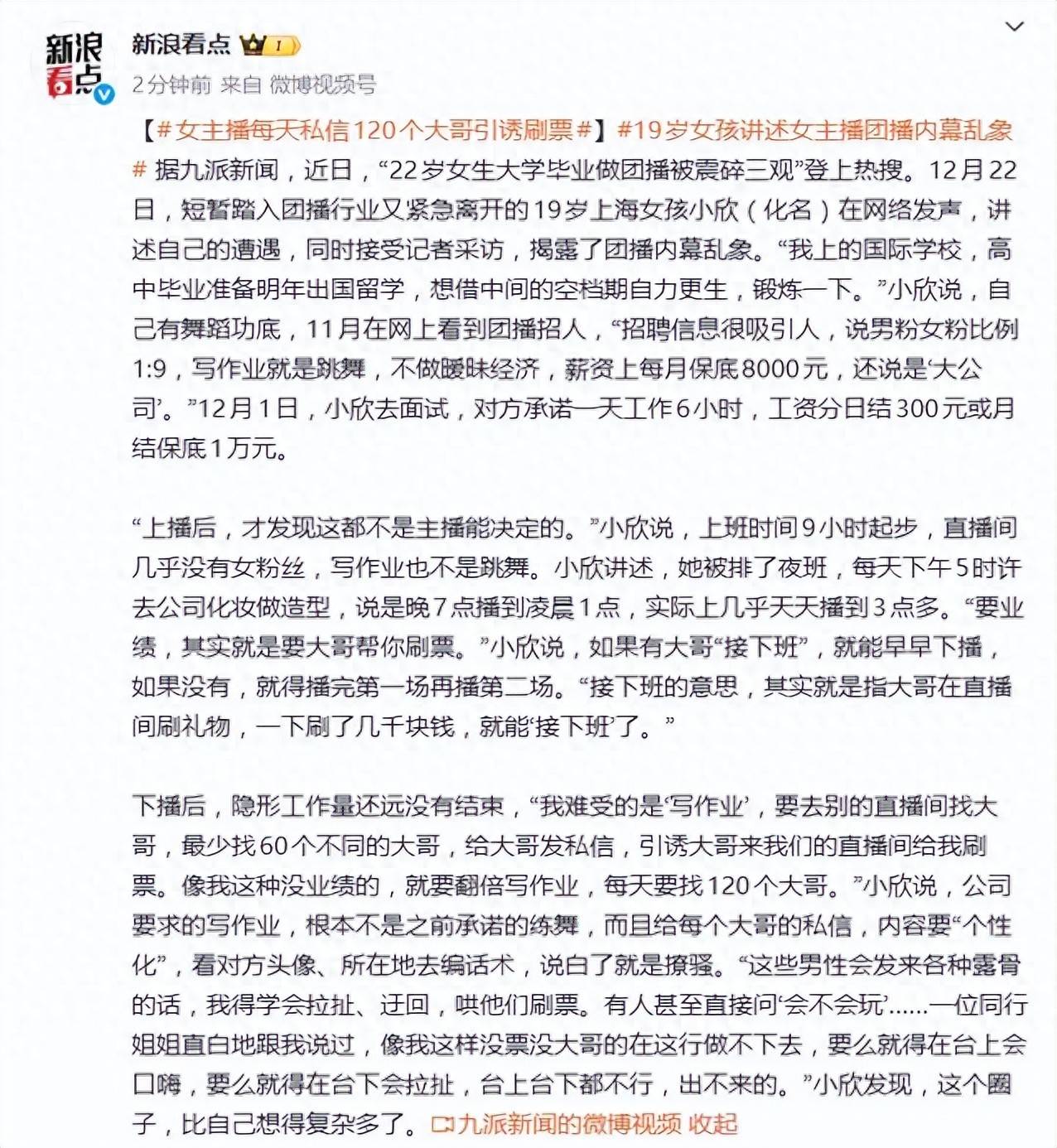 小欣本想利用出国留学前的空档期自力更生。她被一则“男女粉丝比例1:9”、“写作业就是跳舞”、“不做暧昧经济”、“月保底8000元起”的招聘广告吸引,以为找到了一份正经的才艺工作。然而,从12月1日入职第一天起,承诺就碎了一地。