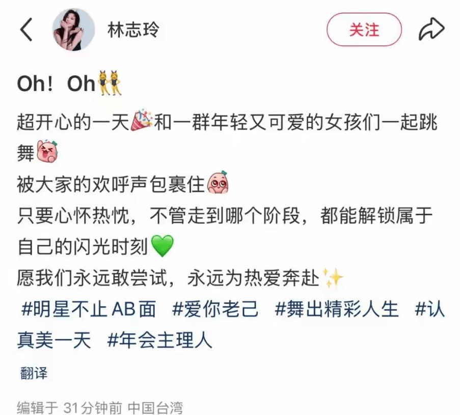 近日,林志玲在社交平台上发文回应穿啦啦队服装跳女团舞,她表示:“和一群年轻又可爱的女孩们一起跳舞,被大家的欢呼声包裹住,只要心怀热忱,不管走到哪个阶段,都能解锁属于自己的闪光时刻,愿我们永远敢尝试,永远为热爱奔赴。”