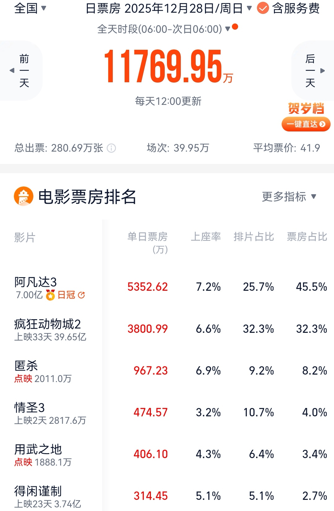 在中国市场上映10天,《阿凡达3》累计票房突破了7亿元,目前单日票房、上座率保持第一,预计最终总票房可能落在10亿元上下。