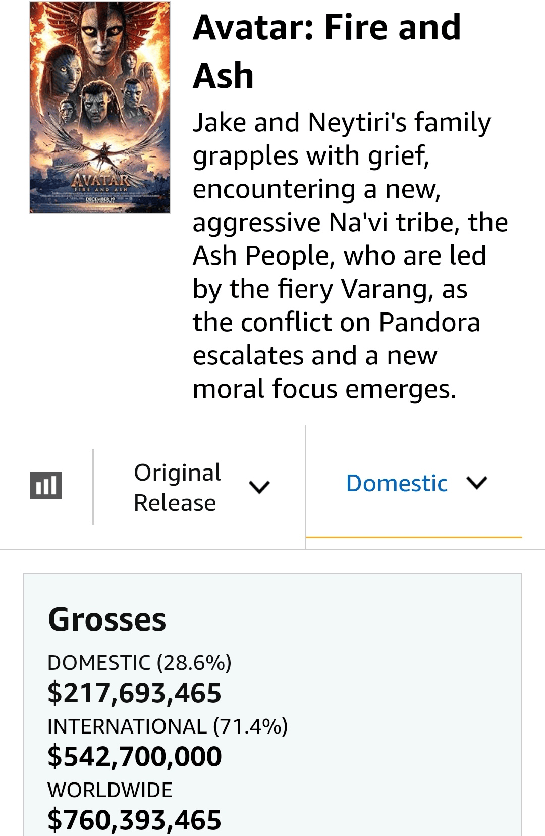 《阿凡达3》北美票房目前累计2.177亿美元,包括中国在内的海外票房目前累计5.427亿美元,全球票房7.604亿美元。