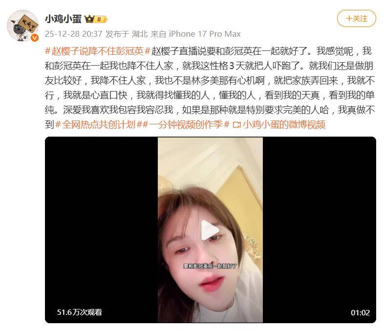 仔细一算,这已经是赵樱子这个月第三次因情感话题引发争议了:12月初刚高调官宣“小12岁男友”,没过多久就被扒出“蒋毅求婚”剧本翻车、狼狈删视频;如今话题一转,又拉上了老搭档彭冠英。一连串操作被网友犀利总结为“情怀消耗链”:从国民剧初恋到“疯批”话题女王,如今连“林多美”眼里的光,在部分观众看来都只剩下了流量计算的精明。