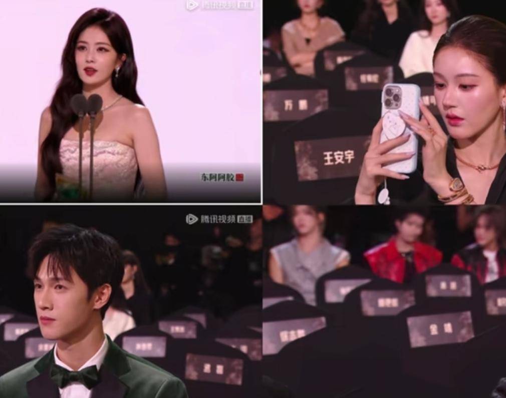 张凌赫发表获奖感言时,她的神情同样很冷淡,还低着头,借着衣领的掩护,偷偷玩起手机。