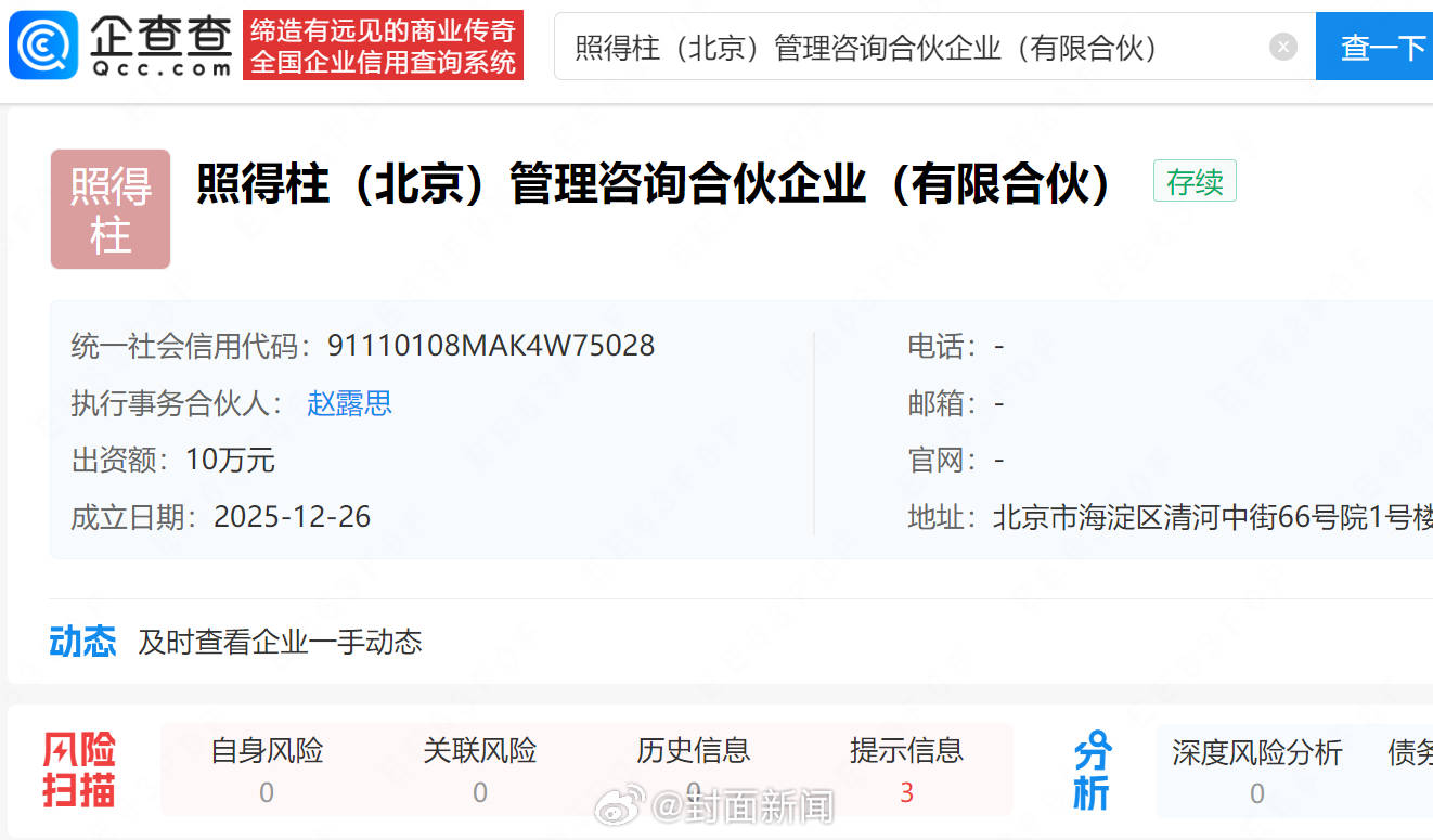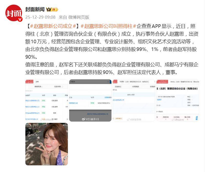 据12月29日报道,近日,一则工商信息让当红小花赵露思的商业版图浮出水面。一家名为“照得柱(北京)管理咨询合伙企业(有限合伙)”的公司正式成立,而执行事务合伙人一栏,赫然写着赵露思本人的名字。这波操作,瞬间点燃了网友对明星“自立门户”与家族资本运作的好奇心。