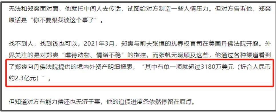 围观到这,也是感慨郑爽在美国越混越差了,还记得她和前夫张恒打官司,被扒出名下资产超2亿,从离婚到争抢孩子抚养权,郑爽还是请了律师,从她的反应看,结果应该符合预期。