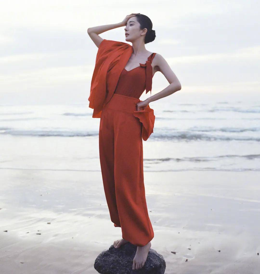 这套红色背心搭长裤的造型像秧歌队的,而摸头掐腰望向远方的动作还不如海边大姨们自然。