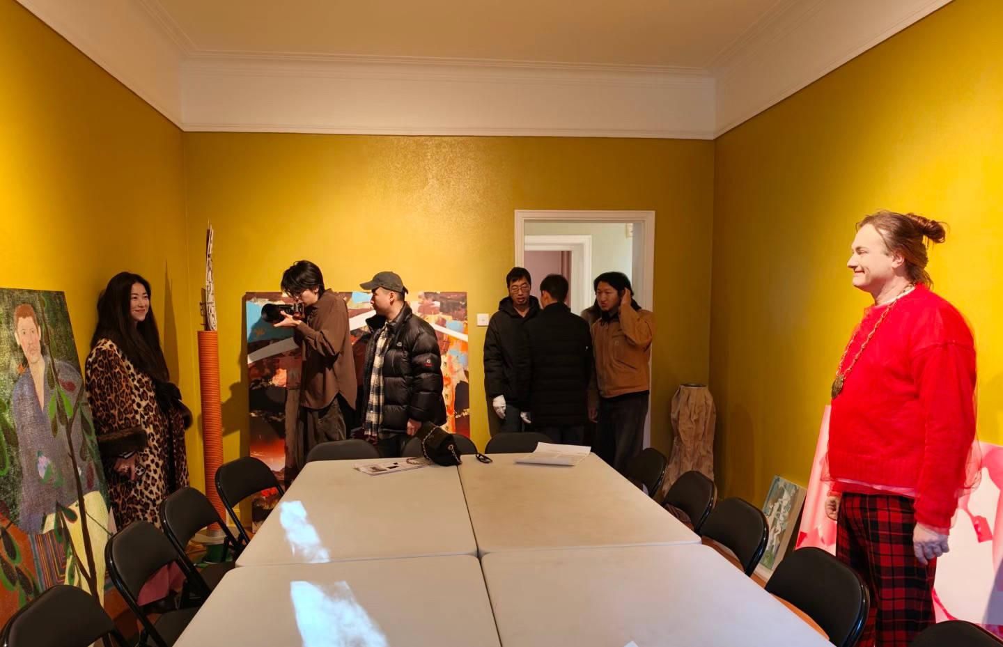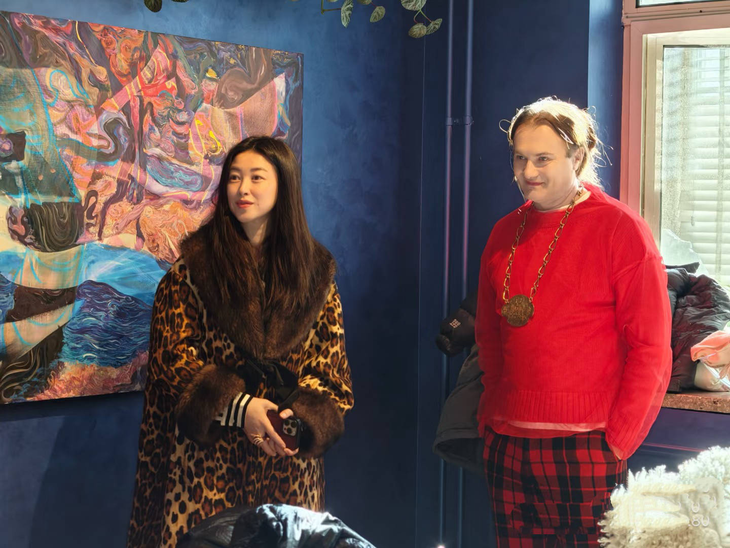这位穿着红衣红裤的,一看就是专业人士,朱珠青岛她帮忙,一起把这场艺术展办的更好。