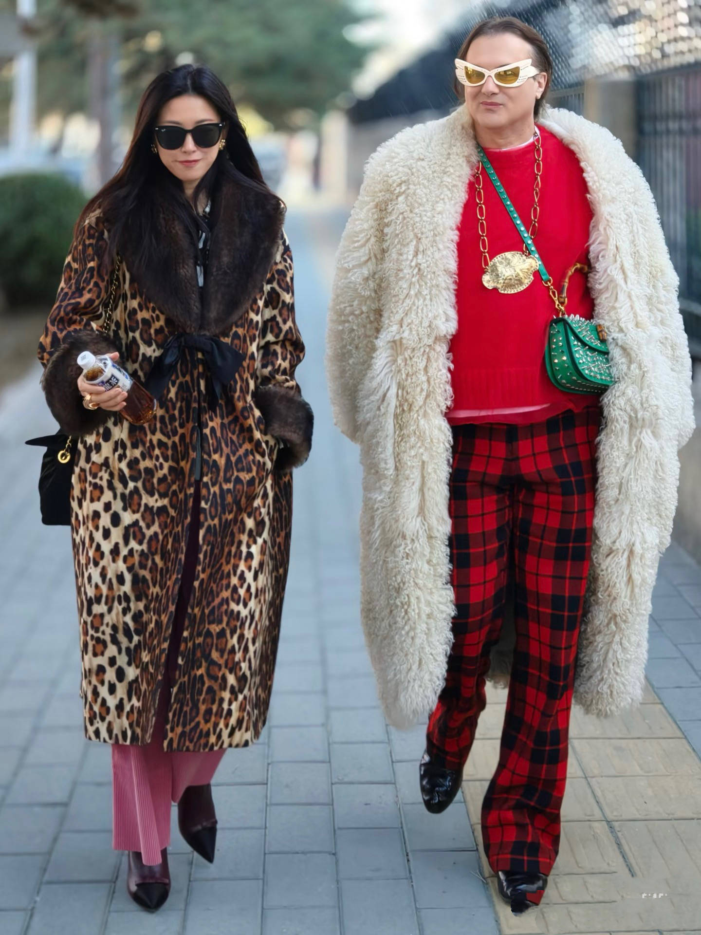 棕色的皮草外套,黑色微喇裤,配上鸭舌帽、墨镜,有一种又拽又酷的感觉。