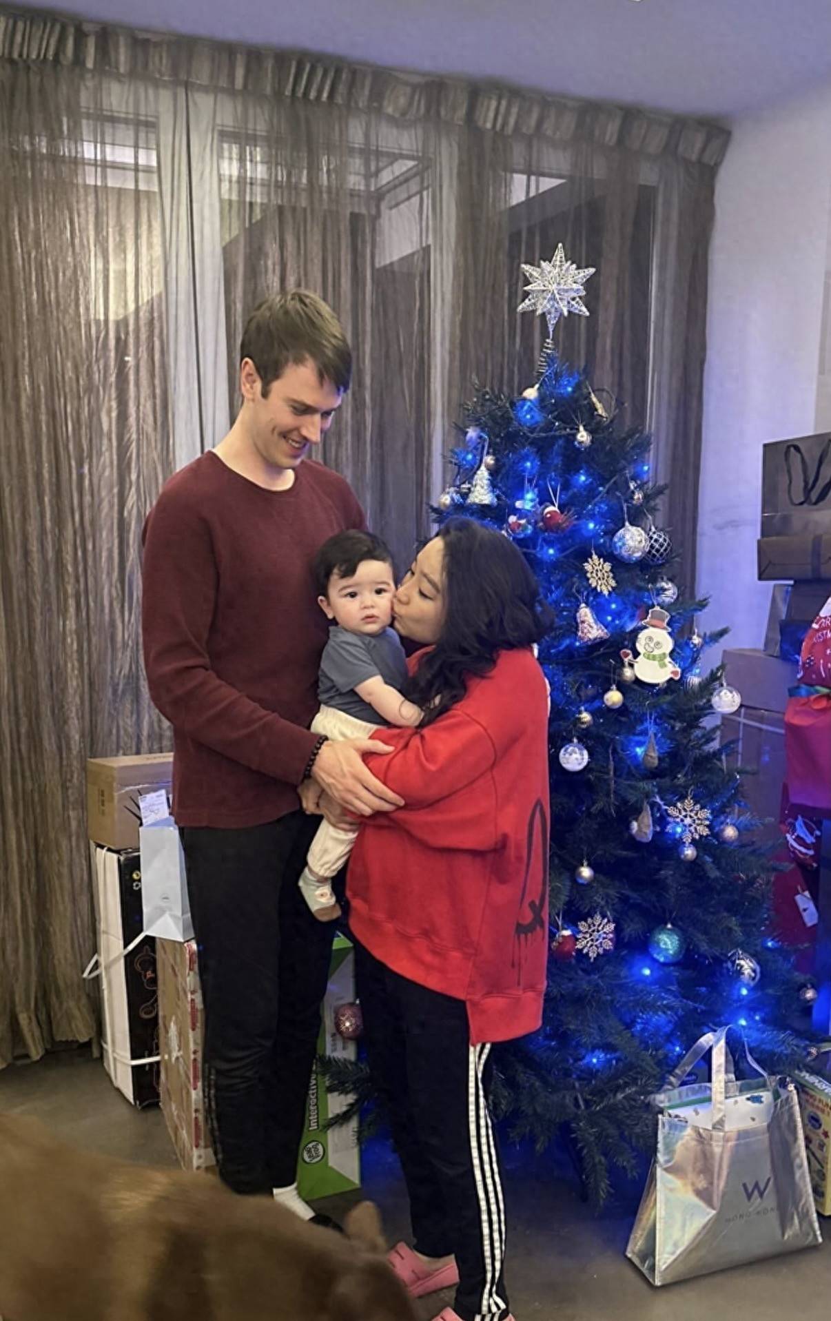 一家人拍了合照,就在圣诞树前面。她穿个红色卫衣配黑裤子,拖鞋都没换,抱着儿子亲了一口。老公站旁边护着他们,一脸温柔。这娃长得真像爸,大眼睛圆溜溜的,胖乎乎的小脸,混血感很强,表情呆呆的但特别萌。