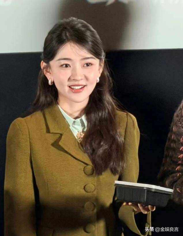 她当天穿了一套绿色的套装制服,版型利落又清爽,不仅衬得肤色更白,还勾勒出了纤细的身形,完全没有其他演员的臃肿感。