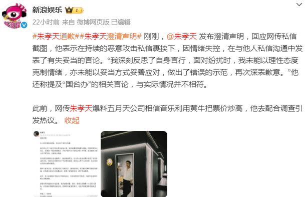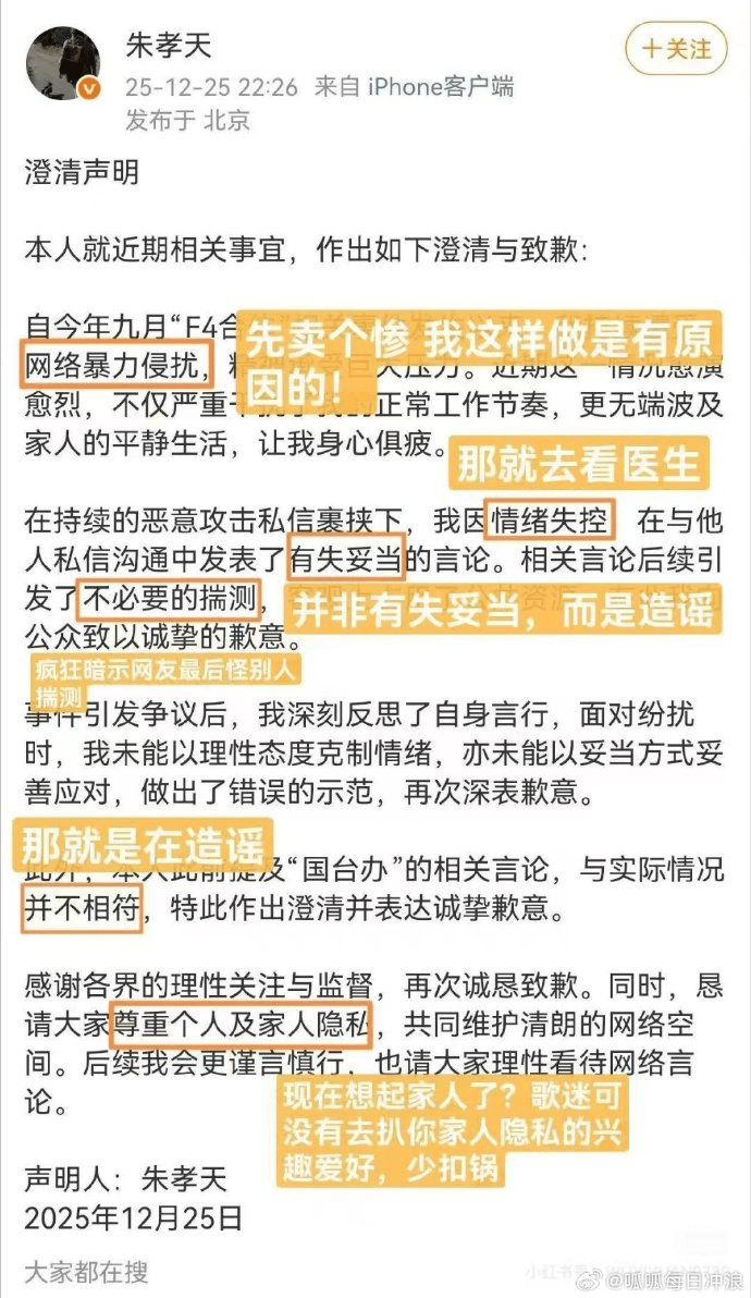 眼看事情闹大,朱孝天又在圣诞当晚火速滑跪道歉了,说他因为长期遭受网暴,情绪失控才说出那些欠妥发言,他的相关言论与实际情况不符,后续他会谨言慎行的。