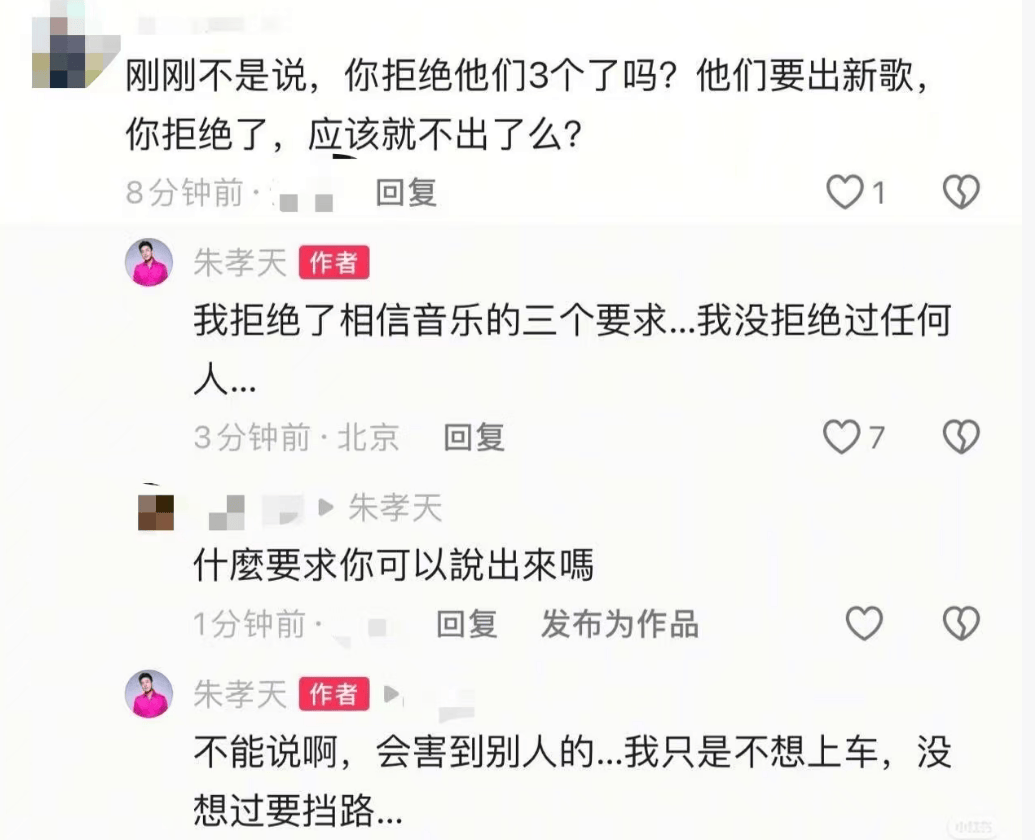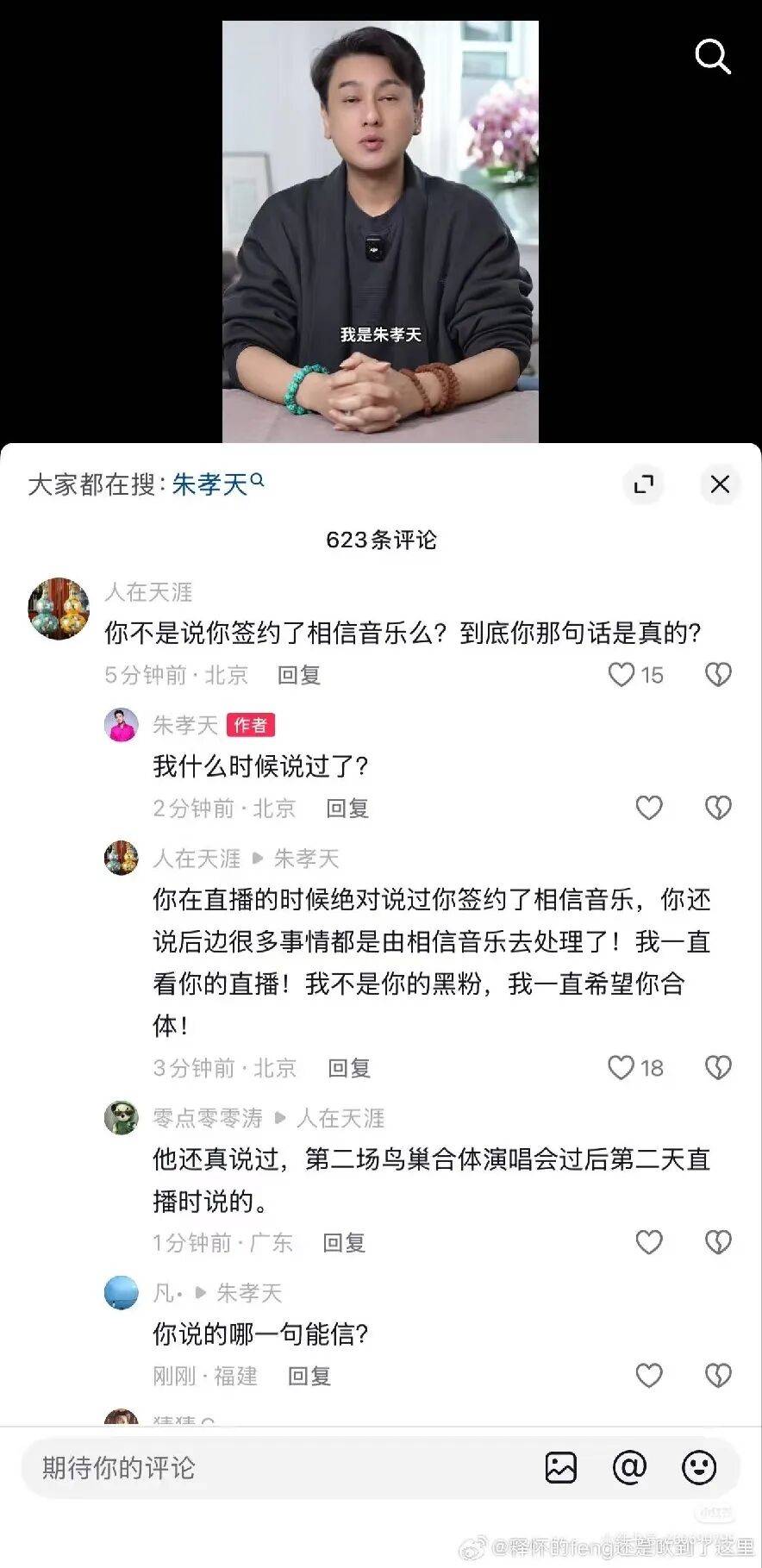 最严重的是,朱孝天还举报了相信音乐,甚至配合相关部门完成调查。他控诉相信音乐涉嫌多项违规行为,包括勾结黄牛炒票、通过跨境贸易公司转移资金逃税、强制艺人假唱等等,甚至还涉及立场问题。
