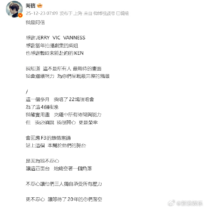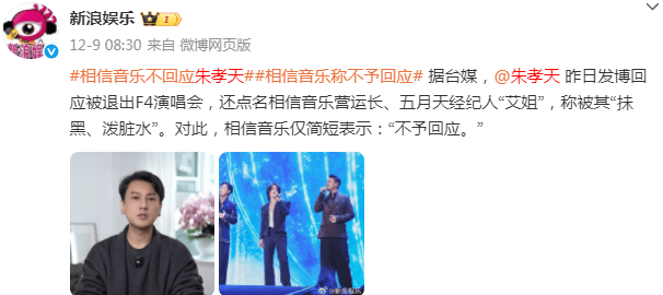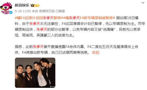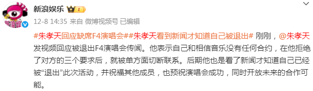 “他也是满心期待,从7月份到现在,没有一点松懈”,朱孝天自己也发了视频回应,说他是看了新闻才知道自己“被退出”的,反手就把F4人没凑齐的锅甩给了相信音乐。