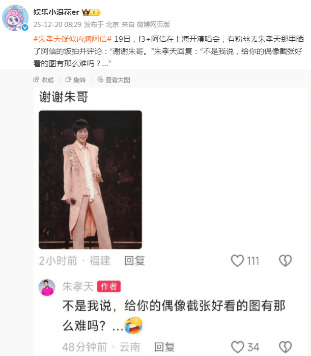眼见F3+阿信这个阵容已成定局,刚官宣的时候朱孝天的戏就已经很多了,等到演唱会真的来了,这哥的一连串操作更是肉眼可见破大防。阿信粉丝跑去感谢他,他先是内涵了一波饭拍图不好看。