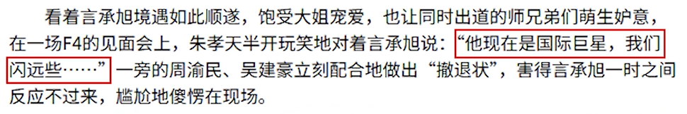 兄弟情肯定是有过的,但可以共患难的人不一定能同富贵,后来F4火遍亚洲,组合当中言承旭的人气最高,朱孝天讲话就开始有点阴阳怪气,说人家现在是国际巨星了,他们得保持距离。