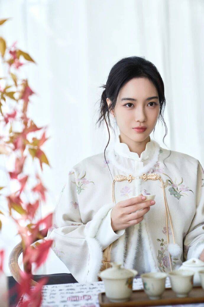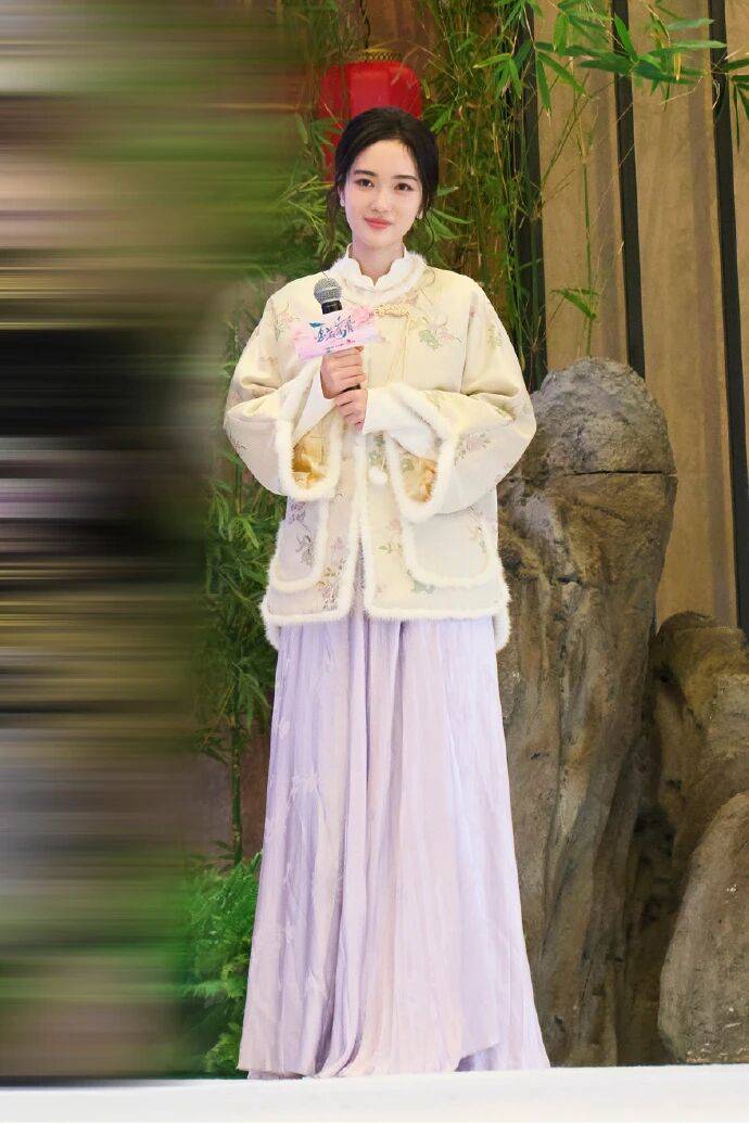 2025年12月29日,赵嘉敏在《玉茗茶骨》开播首映礼上以一身淡米色毛绒新中式上衣搭配紫色长裙的造型掀起热议,被全网盛赞为“新中式美人天花板”,她温婉雅致的东方韵