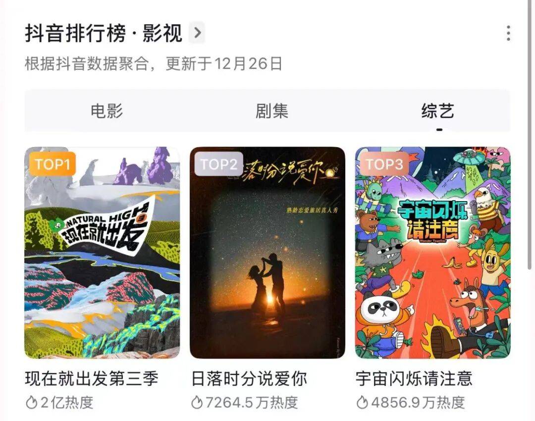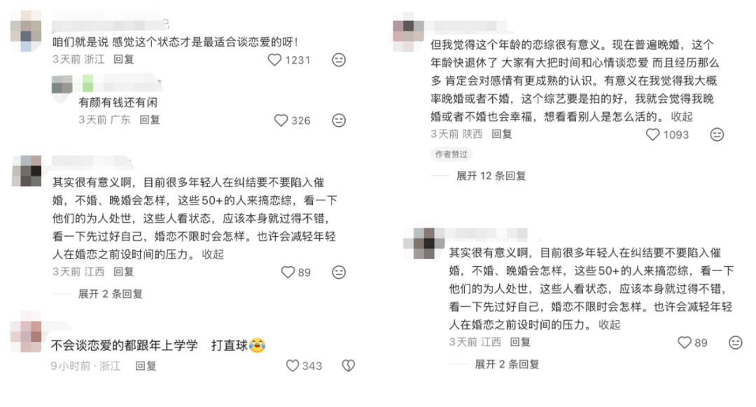 另一方面,拒绝再讲述柴米油盐或中年危机,节目少有地全景式记录了“父母这一代爱情的鲜活图鉴”。它既鼓励50+群体抛开东亚父母身份回归自我、从0踏上生命二次生长的再爱之路,又敢于直面“中老年恋综掏老花镜看菜单”、“退休人群既有时间也有心情谈恋爱”、“恋综8个嘉宾有9个孩子”等现实议题,向年轻观众打样了融汇多维生活系统的高阶亲密关系相处形态。节目开播后,以上“50+恋综名场面”被潮新闻、都市快报等多家千万粉丝级媒体广泛报道,热议话题 #首档全员50岁的恋综来了#、#中老年恋综比短剧有看头# 接连冲上微博热搜,助推这档全素人综艺从众多明星真人秀节目中强势突围,拿到了抖音综艺榜TOP2的好成绩。