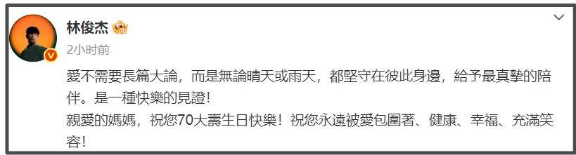 只是在网友看来,林俊杰想法虽好,但安排还是欠妥了,又是庆生又是官宣,混在一起说,既不尊重妈妈,又不尊重女友,赶去评论的明星都没有一个人祝福林妈妈生日快乐呢,果真如网友所说,大家都去关心林俊杰感情问题了,妈妈成了工具人。
