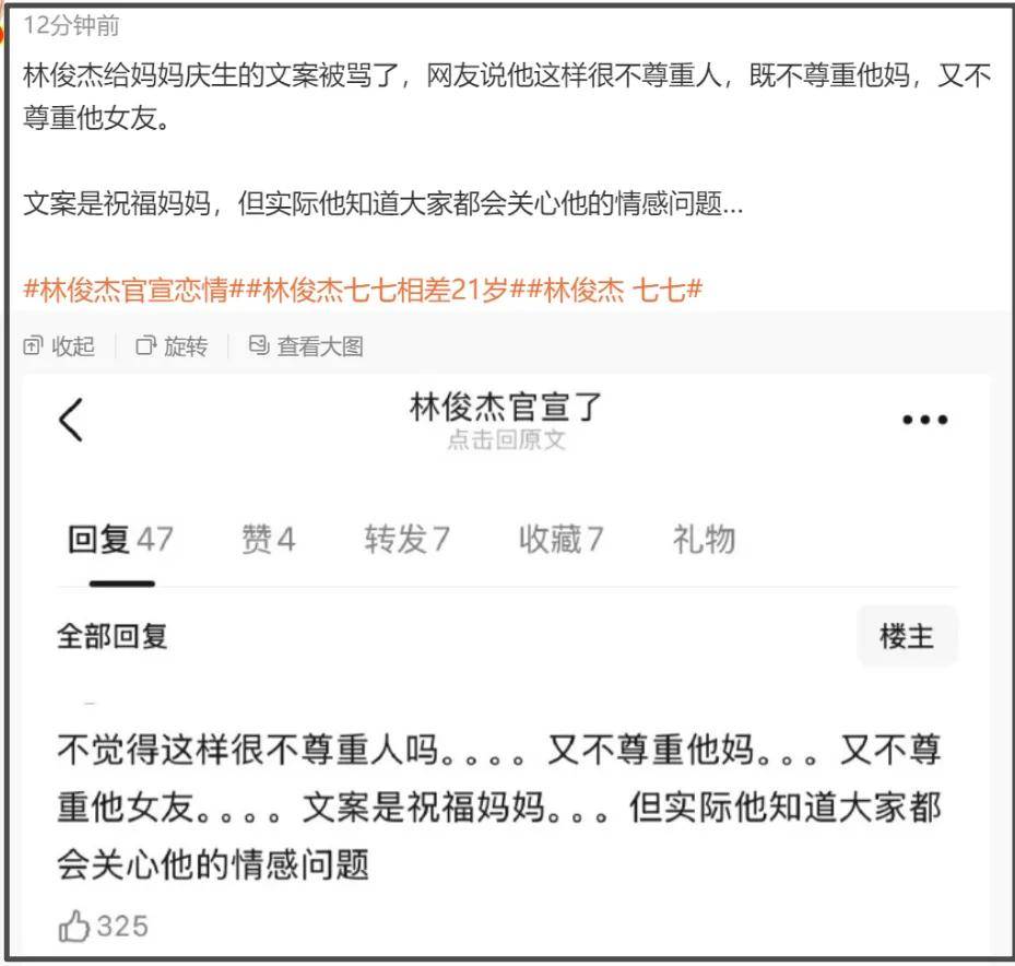 就拿林俊杰官宣文案来说,乍一看是为母亲庆祝生日,细看原来是对女友爱的表白,加上全家福庆生照,明显不止想要表达一层意思,除了承认恋情,更多是为了展示家人对女方的认可。
