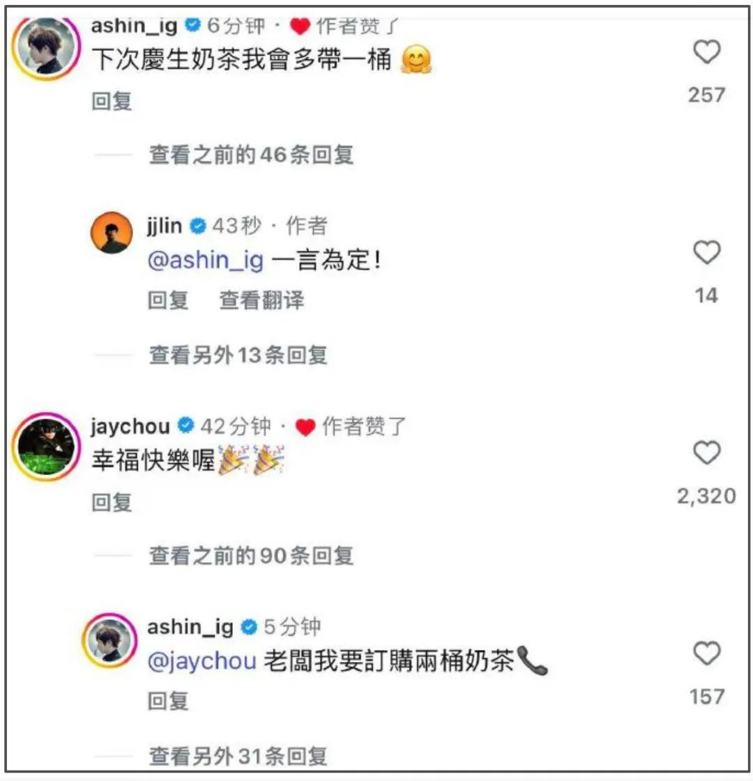 周杰伦、林志颖、阿信等人还跑到林俊杰账号评论区为他送上祝福,气氛相当和谐。
