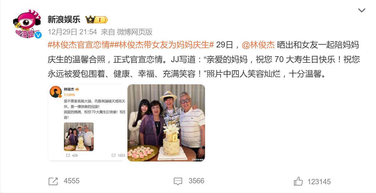 12月29日,华语乐坛“初代顶流”林俊杰的一则官宣,瞬间让社交平台沸腾。他借为母亲庆祝70岁大寿的温馨时刻,首次晒出与23岁女友“七七”(Annalisa)及父母的四人合照,一句“永远被爱包围”,正式宣告脱单。这波“官宣恋情+为母庆寿”的双重甜蜜暴击,让粉丝直呼“幸福拉满”。