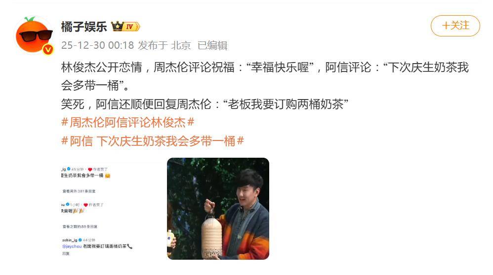 紧接着,“奶茶三兄弟”的另一位成员阿信幽默登场,直接玩起内部梗:“下次庆生奶茶我会多带一桶”。林俊杰秒回“一言为定”,默契十足。阿信随即“加码”,向周杰伦喊话:“老板我要订购两桶奶茶”。这番以奶茶为暗号的趣味互动,瞬间点燃全网,被网友调侃为“奶茶兄弟终于集体营业”、“这是要开奶茶祝福派对吗?”。