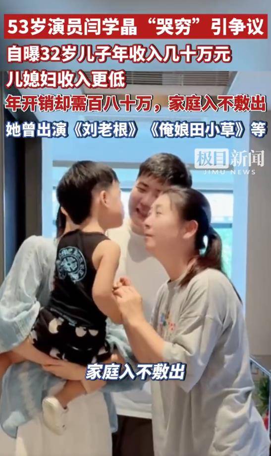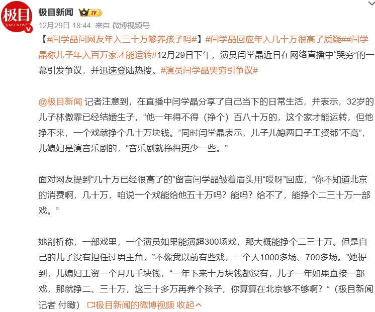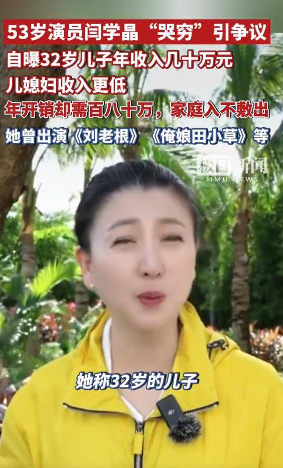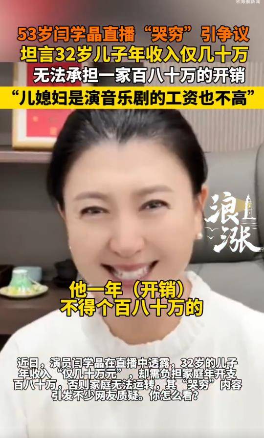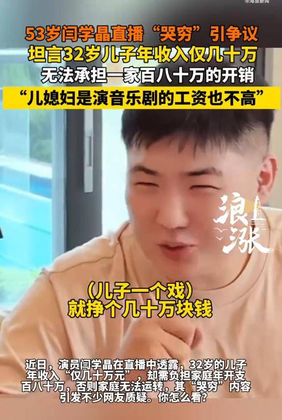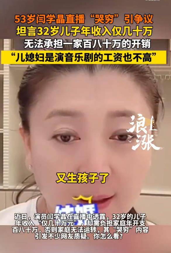 热搜“闫学晶说儿子一年挣几十万不够花”背后,是一场明星与普通人对“生存成本”认知的剧烈碰撞。12月29日下午,演员闫学晶在直播中谈及32岁儿子林傲霏的生活现状时眉头紧锁,一句“他一年得不得(挣个)百八十万的,这个家才能运转”瞬间点燃舆论。当网友留言“几十万已经很高了”,她用一声“哎呀”回应,随即细致算账:儿子一部戏挣二三十万,儿媳演音乐剧年收入不足十万,三十多万在北京养孩子“根本不够”。儿子如果在电视剧行业坚守会很难,压力非常大,另外一个出路就是跑横店闯一闯。