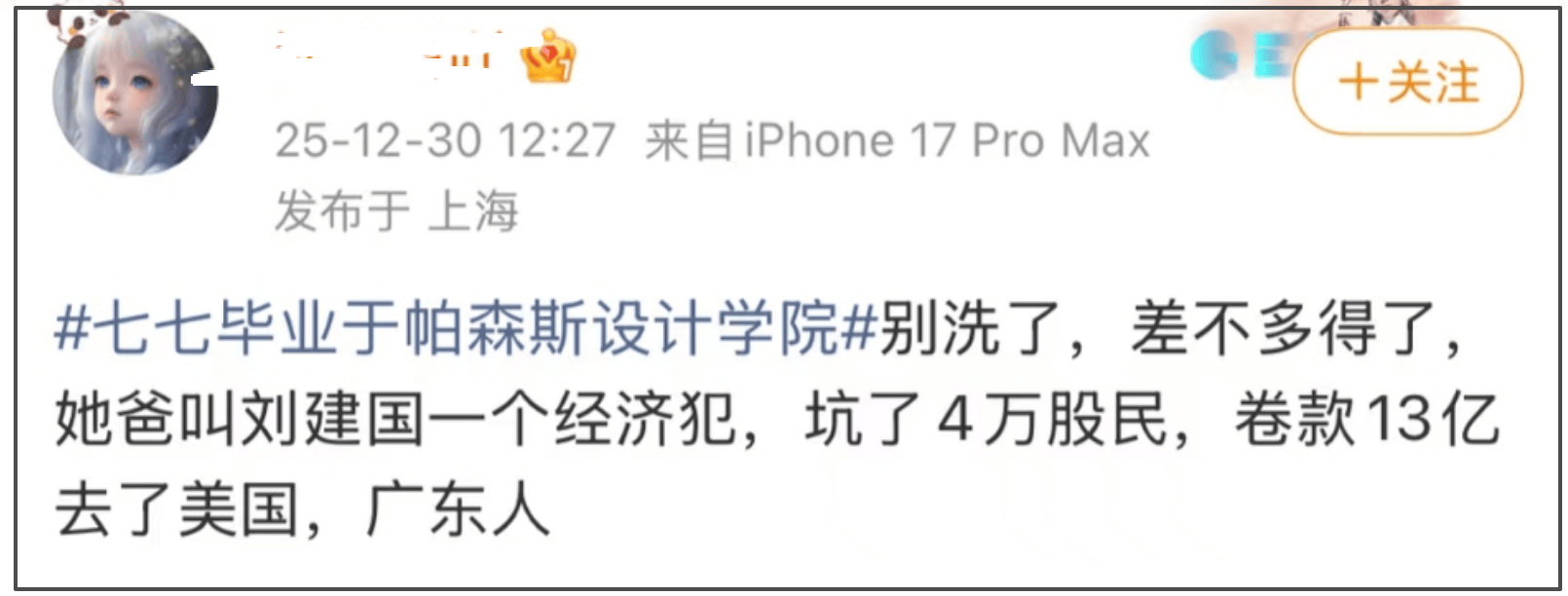 七七的大名一直没有公开过,目前网传的大名是刘偲敔,有网友扒出其父亲疑似跟一起经济案有关,卷款13亿去了美国。此前也有爆料称其家庭有经济案纠纷,但都没有实锤证实。若属实的话,林俊杰的风评要受影响,而七七全身名牌及全世界各地有豪宅的富家女形象可能也要彻底破灭。