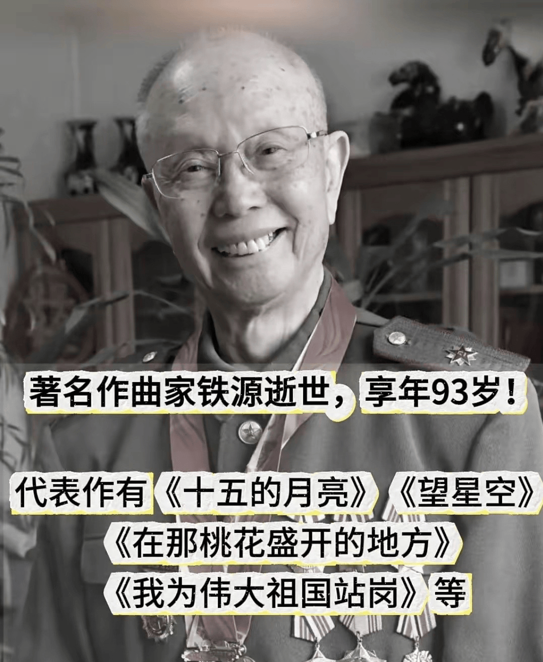 12月29日,又传噩耗!著名的作曲家铁源在沈阳因病逝世,享年93岁。你可能不熟悉他的名字,但一定听过他的歌。《十五的月亮》、《望星空》、《在那桃花盛开的地方》、《我为伟大祖