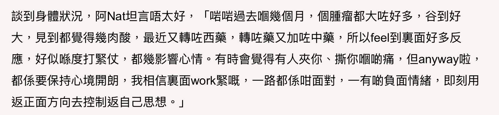 别看吴文忻在舞台上表现大勇,毫无怯场,但实际上她的身体状况并不是太理想。她公开个人近况称,过去的几个月,身体的肿瘤又大了很多,自己看到都觉得恶心。为了治病,她如今又换了西药来治疗,同时还加入了中药,所以身体反应剧烈,备受煎熬,心情非常不好。吴文忻自曝如今身体的感受就是好像有人在撕裂自己的身体这般,痛苦难耐,而因为肿瘤变大的速度加快,她不得已要接受另类治疗,需要抽掉不少血,但是过程非常痛苦,所以她暂时不愿意透露更多。