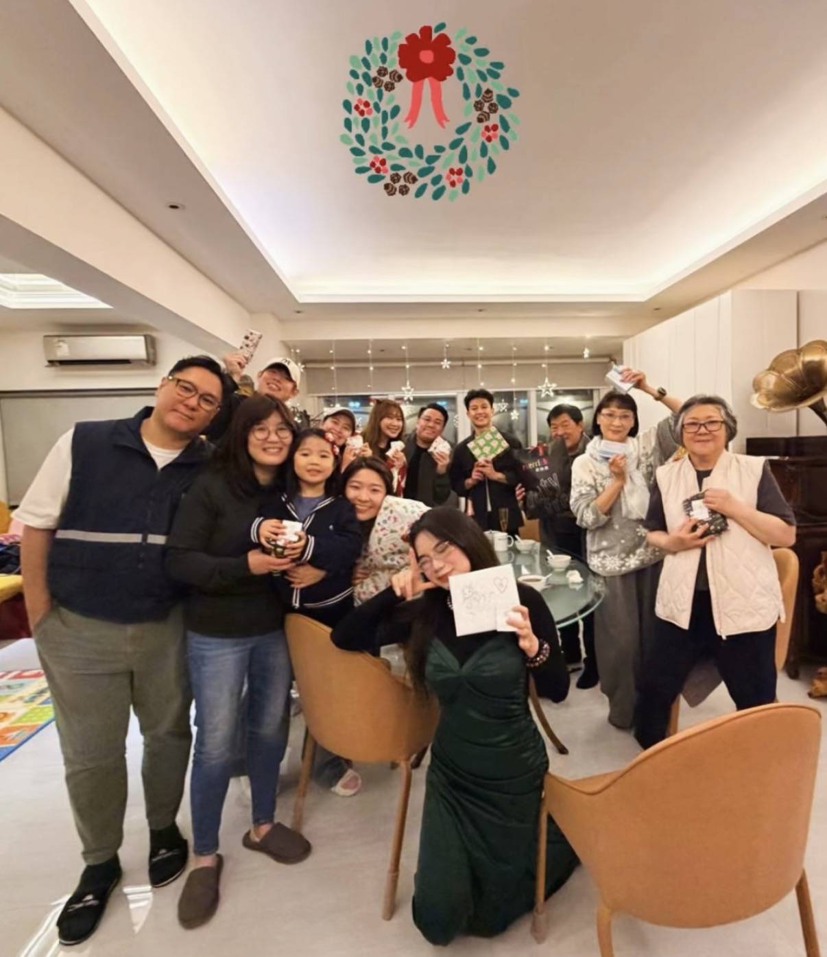 一行十数人齐聚在许绍雄的豪宅,酒足饭饱,交换礼物后,不忘大合照。大合照就是随意站,没有太多的讲究。许绍雄的遗孀龙嬿而与妹妹站在一边的前排,继子一家三口站在另一边的前排,许绍雄的女儿与侄女在一起,最中间以及后排的是罗乐林的女儿。从照片可见,龙嬿而状态不错,她手上拿着礼物,露出淡淡的笑容,相信在家人的陪伴之下,她的状态会慢慢回到从前。