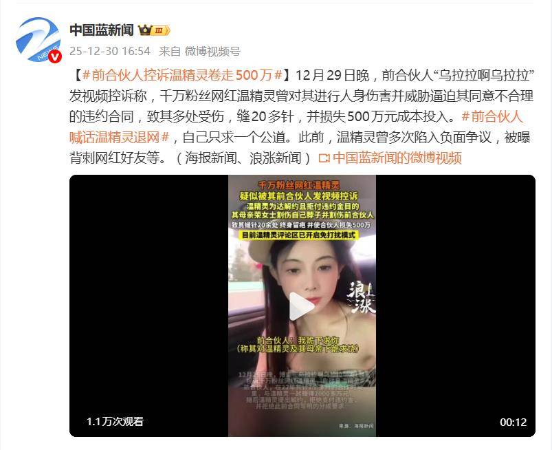 据12月30日报道,近日,网红“温精灵”与前合伙人的一场陈年旧账,以极其戏剧性的方式重回公众视野。前合伙人发视频控诉,三年前遭遇了一场“现实版胁迫戏码”——“温精灵”母亲以砸玻璃杯自残、扑向其致手部重伤缝合20针,最终逼迫他签下让其净亏损数百万元的解约协议。这番指控瞬间将“温精灵”推上风口浪尖。