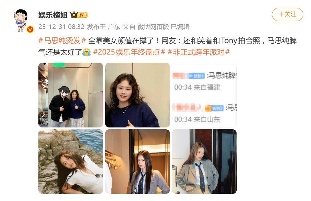 据网友12月31日爆料,马思纯的最新烫发造型,最近在社交平台上结结实实地“火”了一把。只可惜,这把火是“翻车”的火——新发型被网友集体吐槽