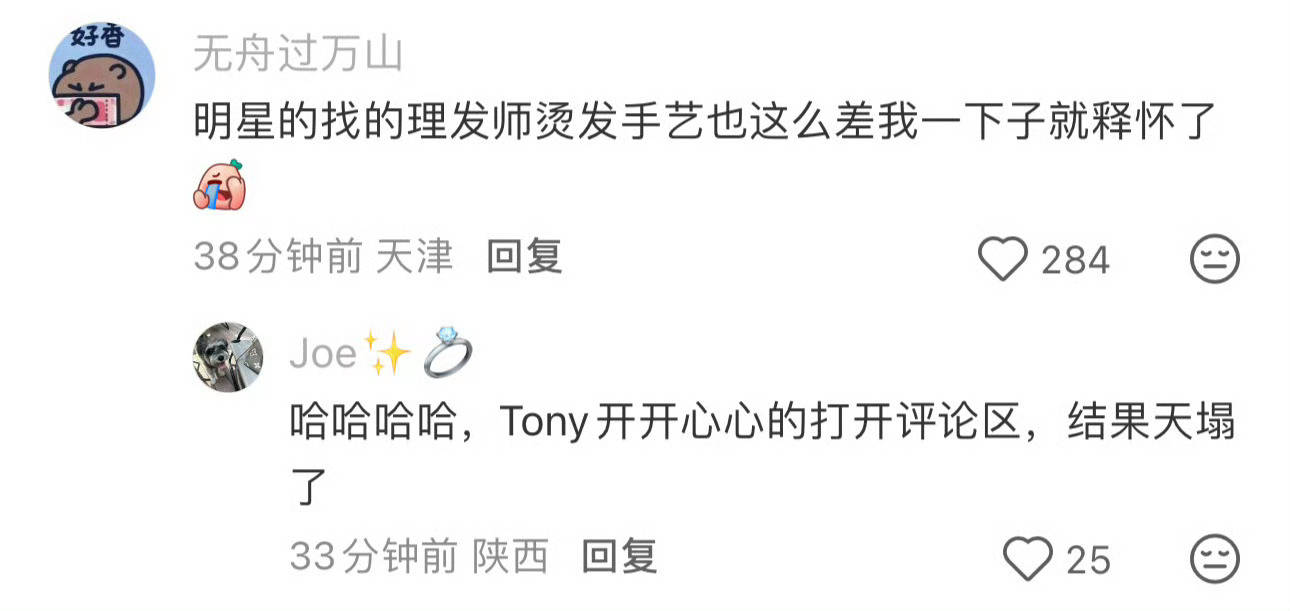 评论区瞬间成了大型“释怀”与“避雷”现场。有网友感慨:“明星花大价钱找的专属理发师手艺也能翻车,我对自己小区理发店的Tony瞬间释怀了。”大家更是总结出几大翻车雷点:过度使用精油导致头发贴头皮、小卷弧度显老气冲天、发缝分得死板生硬。网友们纷纷呼吁发型师们手下留情,务必避开“老婆子式贴发”和“步惊云式爆炸卷”这两种极端。戏谑调侃也层出不穷,有人建议“马思纯下次开庭(如果有)时记得带着这张照片”,也有人直接喊话Tony老师:“下次别发了,真的。”